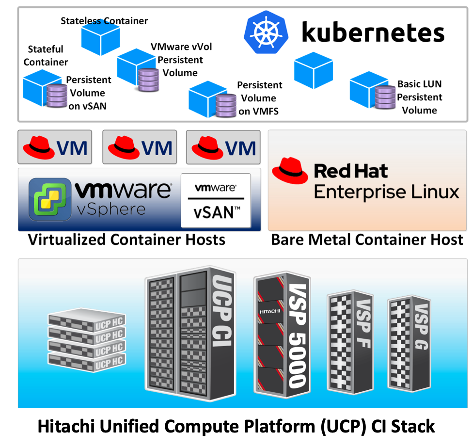 Hitachi Unified Compute Platform (UCP) CI is an optimized and preconfigured converged infrastructure platform. UCP CI offers a broad range of compute and storage components that can be scaled and configured independently to eliminate overprovisioning. With UCP CI, you can optimize your data center to run any container application workload, at any scale combined with the Kubernetes container orchestration platform. The figure below shows a high-level diagram of Kubernetes managing containers and persistent volumes on the UCI CI stack or with Hitachi VSP systems. It can be run on VMware, as bare metal, or as a combination of VMware and bare metal.